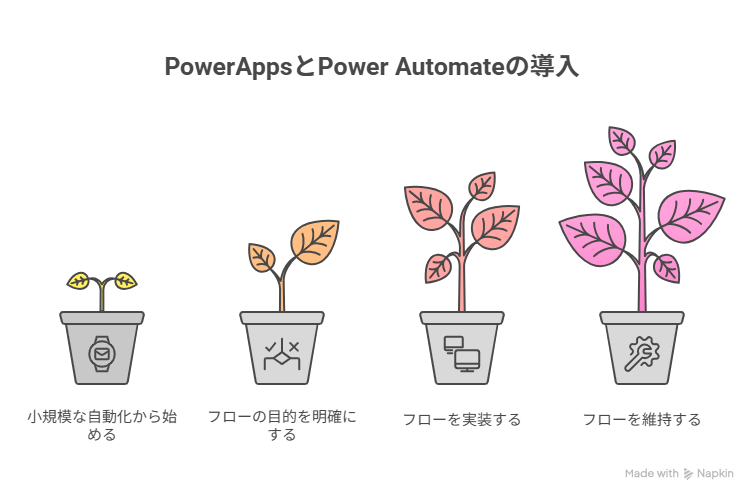PowerAppsとPower Automateを業務に導入する際は、いきなり大規模な自動化に挑戦するのではなく、まずは小規模なプロセスから取り入れるのが成功の鍵です。例えば、簡単なメール通知やExcelへのデータ保存といった単純なフローを作成し、実際の現場で使って効果を確認することから始めましょう。導入初期には「誰が」「いつ」「どのような目的で」フローを使うのかを明確にしておくことも重要です。これにより、利用者が迷わず活用でき、定着もしやすくなります。さらに、運用開始後は定期的にフローのメンテナンスを行い、不要になった処理や改善点を見直すことが大切です。