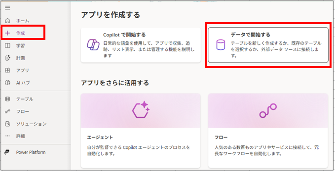次に、PowerAppsでアプリを作っていきます。PowerAppsは初心者にもやさしい設計で、ほとんどの操作をマウスで完結できます。