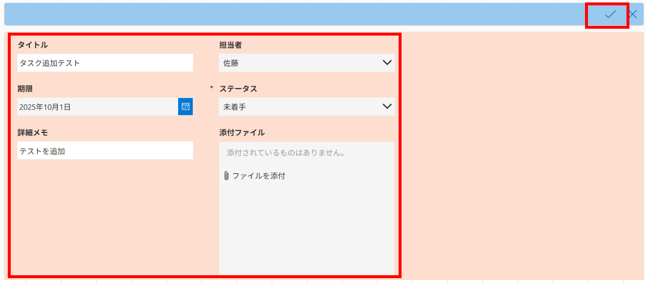 アプリの右上にある「+」ボタンをクリックして、新しいタスクを追加します。タスク名、期限、担当者、ステータス、詳細メモを入力し、「保存」を押すとSharePointに登録されます。登録直後にリストに反映されるため、リアルタイムで共有可能です。