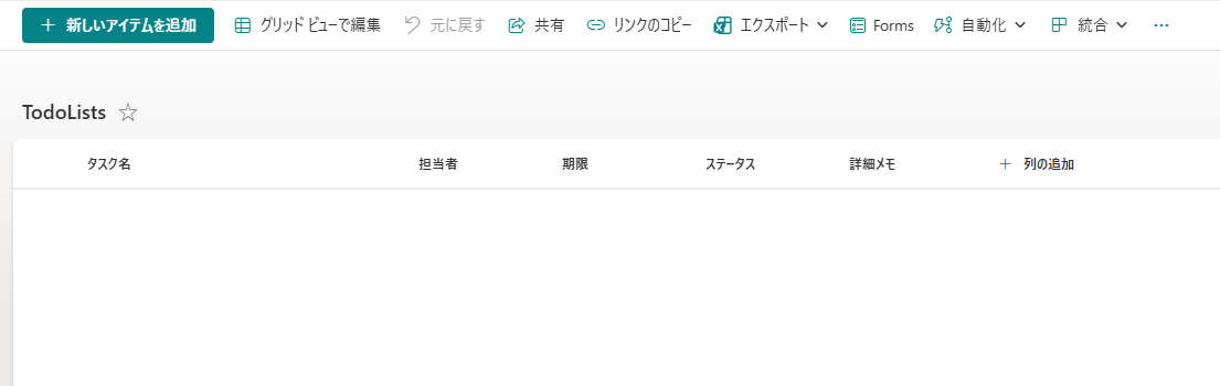 アプリを作る前に、SharePoint上にタスク管理用のリストを作成します。リストはデータベースのような役割を果たし、PowerAppsはそのリストをもとに画面を生成します。