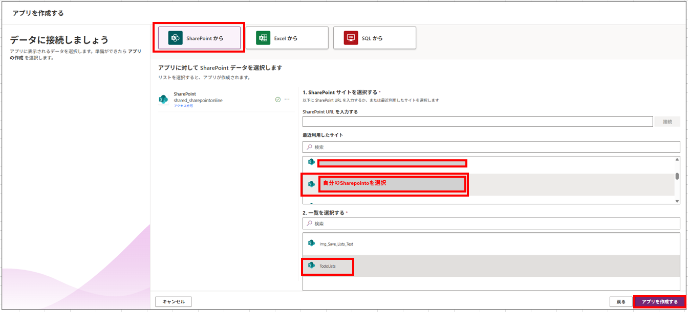 外部データに接続→Sharepintoから→自分のTodoリストを作成したSharepointoを選択→「ToDoリスト」をデータソースとして選びます。